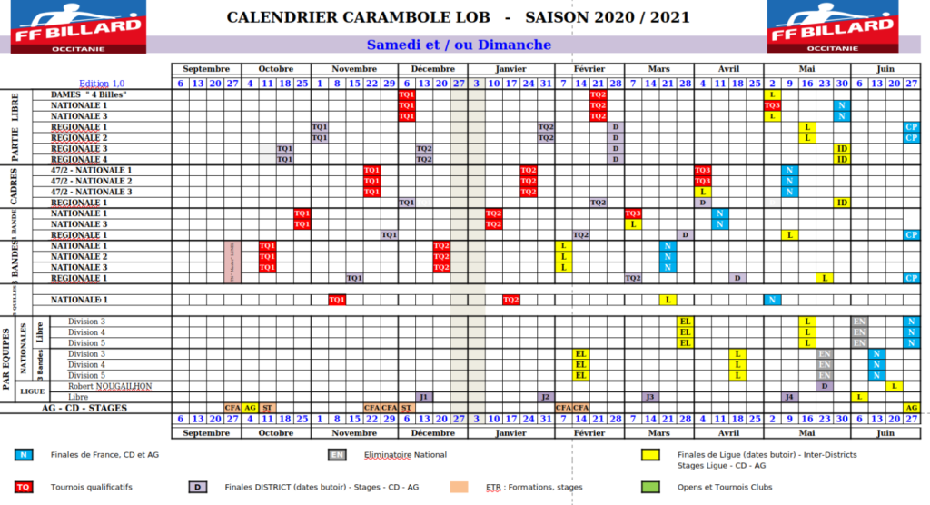 Calendrier 2020-2021 FFB Carambole – Billard Français